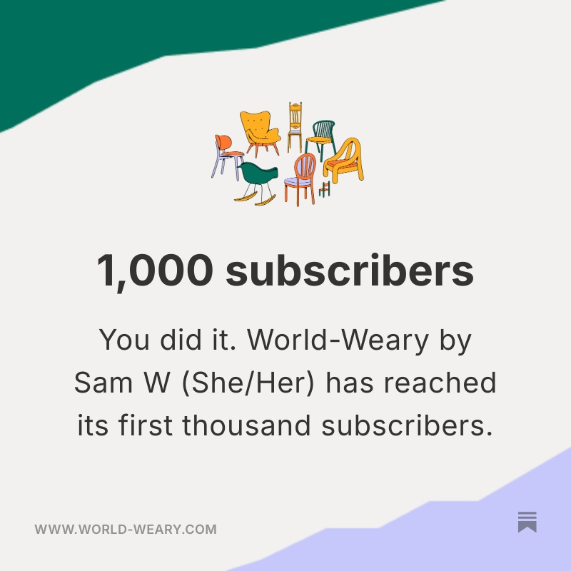 Not only has World-Weary reached the 1000 subscriber milestone, I’m proud and excited to say we sprinted straight past it. We’re approaching 1,200 at this rate.